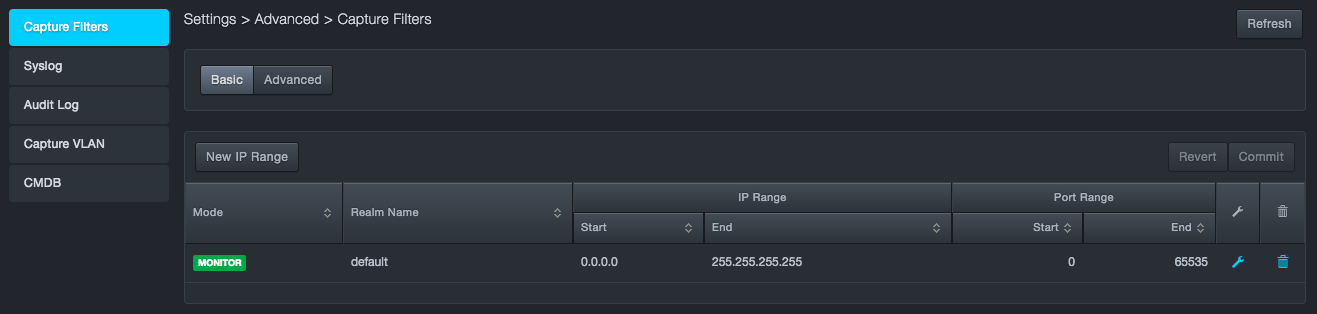 | Settings > Advanced | Capture Filters = configures the system to monitor or ignore a range of IP addresses within a defined IP realm. | Chapter 3 |