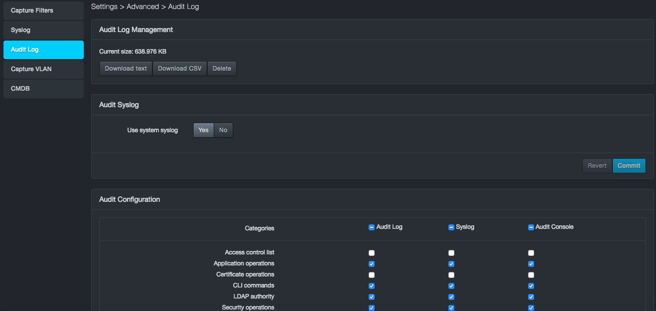 In the left pane, click Logging. The Audit Log page appears. The Audit Configuration area shows the categories on the left side and columns for the audit log, syslog, and audit console.