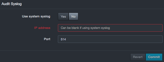 | IP address | IP address of the destination where the audit syslog should be sent. If the destination is the system syslog, you can leave this field blank. |