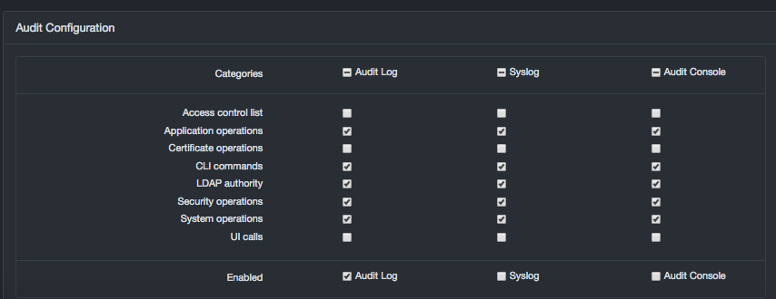 Under Audit Configuration, check the categories you want to show in the audit log, syslog, and audit console. Uncheck the ones you want to hide.