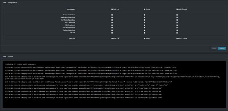 Audit Console displays a live audit console similar to the following at the bottom of the page for viewing audit log entries in real time. You must click Commit to display the console.