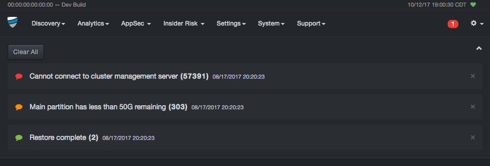 To clear individual alert messages, click the X at the top-right corner of the message. To clear all messages and close the panel, click Clear All at the top-left side of the panel and select Yes when prompted. To close the panel without clearing messages, click the up arrow at the top-right side of the panel.