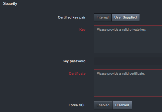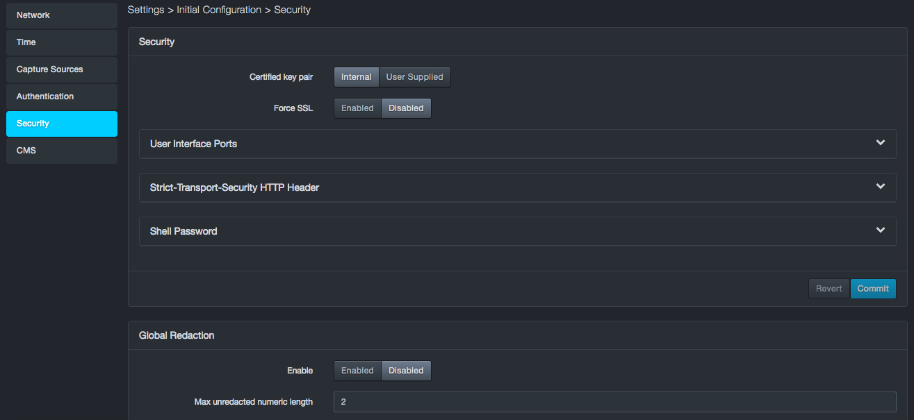 | Security = configures Secure Sockets Layer (SSL), key pair, SSL, user interface port, strict transport security HTTP transport, shell password, and global redaction settings. | Chapter 3 | |