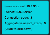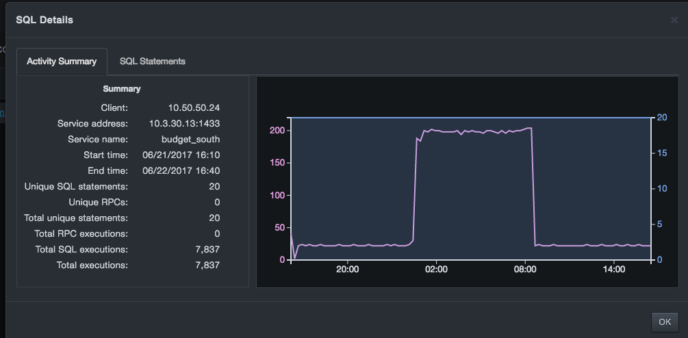 You can continue clicking subnets until you reach the lowest level, which is a single client connection to a single database service IP, port, and service name. When you reach the lowest level, a SQL Details dialog box similar to the following appears. The dialog box provides two tabs: