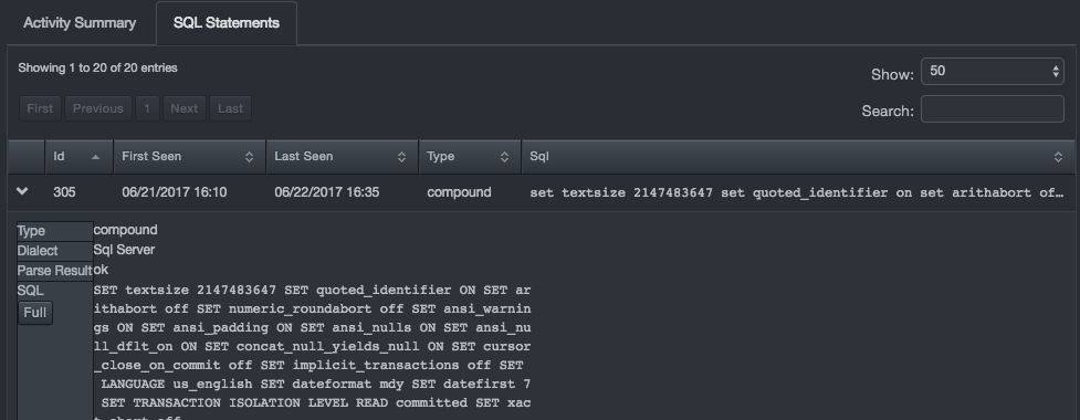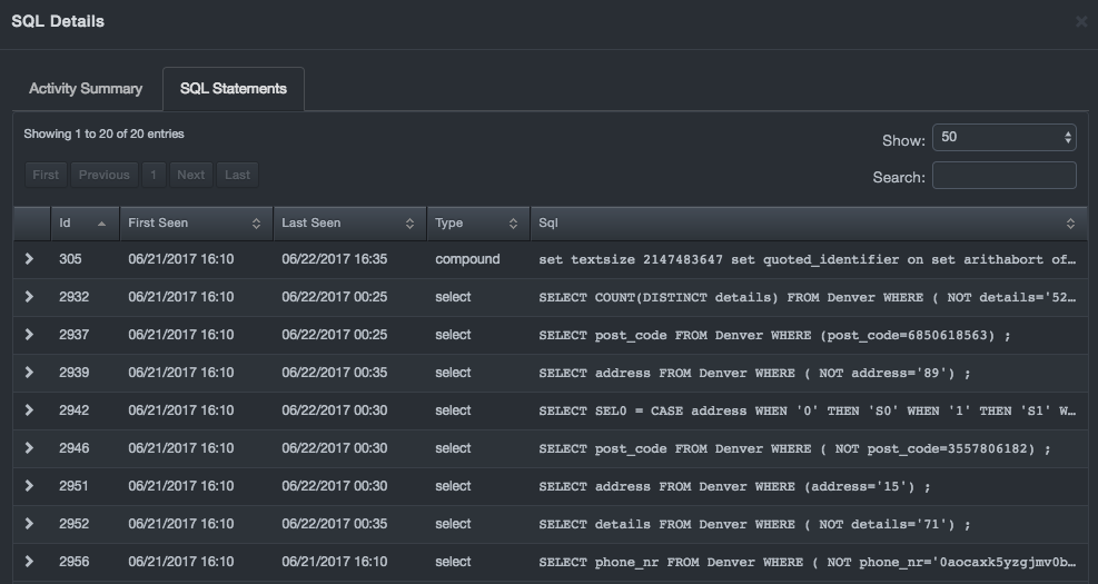 The SQL Statements tab contains a list of the SQL statements that the DBC platform observed between this client and this database service. Statements are presented in tabular format, with support for paging, sorting, and searching.