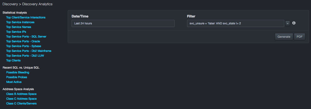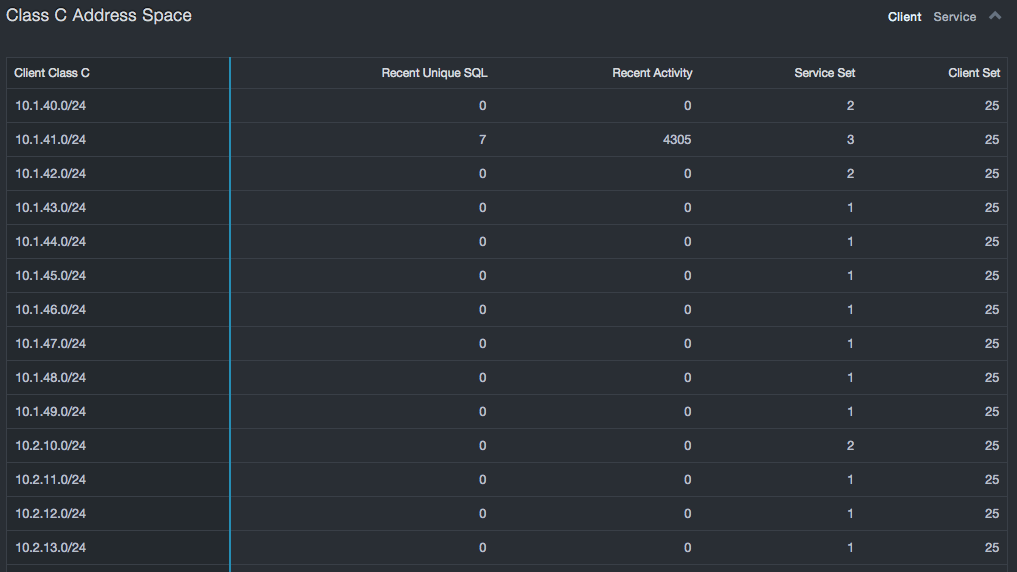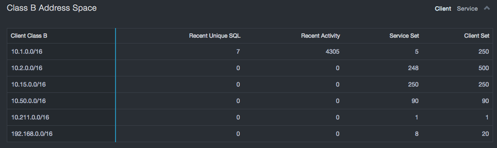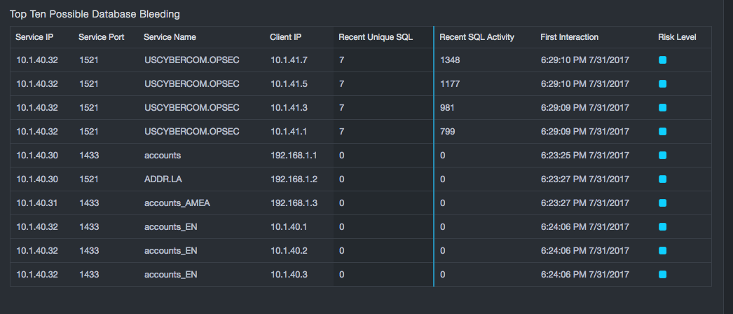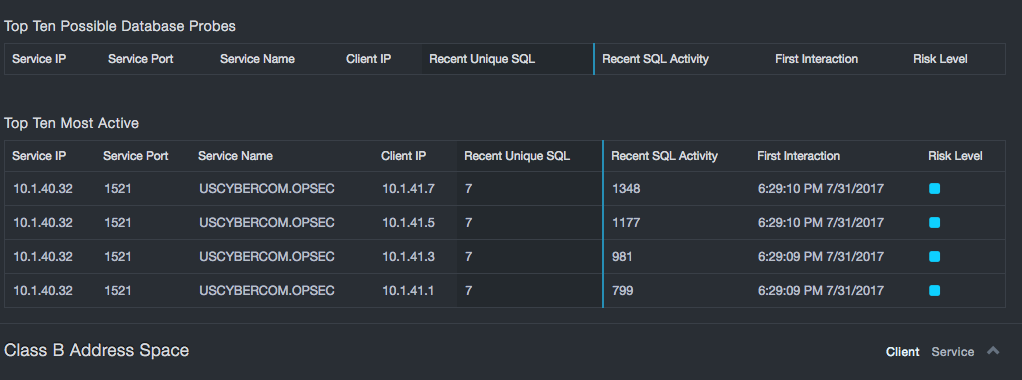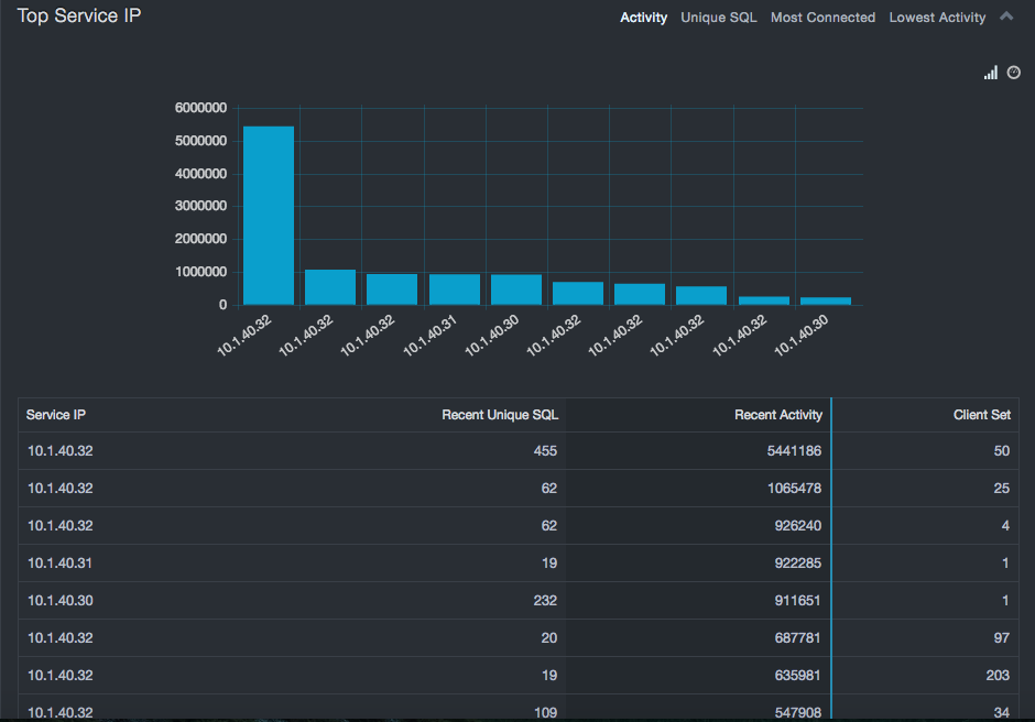 In addition to security related aspects, these statistics can show risks of overload on servers by pointing to the most heavily loaded devices. Addressing these possible overload conditions can help avoid system outages or sub-optimal performance in the future. The Top Service IP table shows the least loaded database servers, which could provide guidance in consolidating or redistributing databases to reduce licensing costs or improve performance.