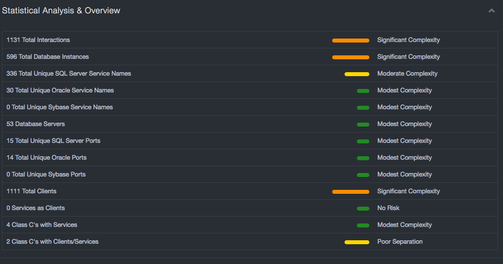 The Unique SQL and Oracle service name counts provide insight into how many different service names were found, which provides a stronger indicator of the range of functionality within the database environment. Note that this number reflects unique service names without regard to capitalization, so poor application coding practices do not skew the results. The larger the range of functionality, the greater the risk. At a minimum, each different. service name should have a security profile that should include the database servers on which it can be deployed.