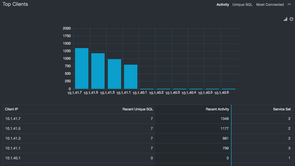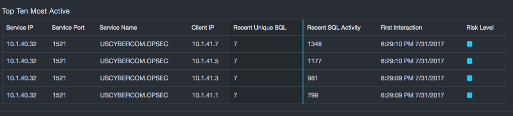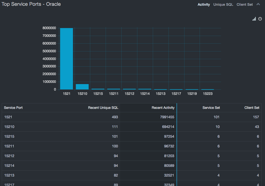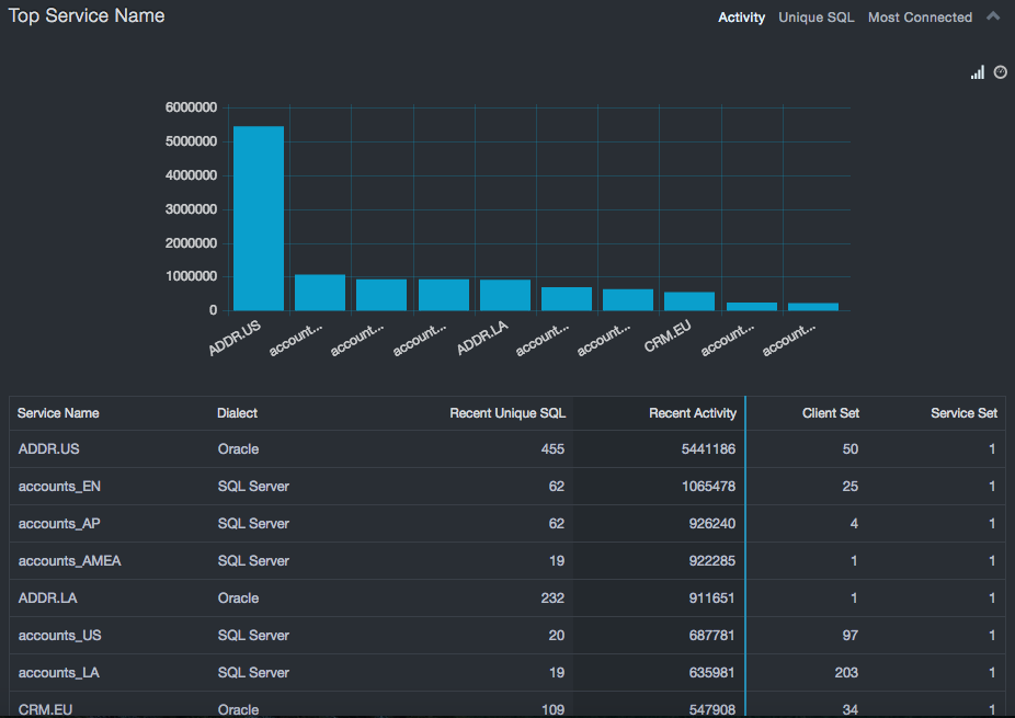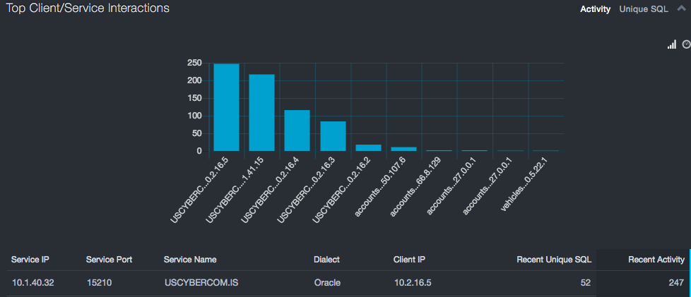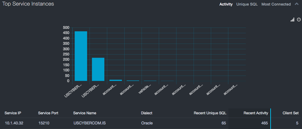 Top Service Instances refers to unique service names that are exhibiting the most executions, the most unique SQL statements, or are communicating with the largest number of clients. As with interactions, large numbers of executions or large variations in the SQL statements are typically associated with application servers, report generators, or tools. If services are not associated with that type of functionality, there could be a security risk.