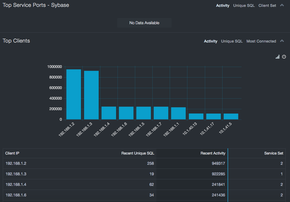 The Top Service IP report focuses on database server statistics. These are useful in determining whether there are servers in less secure portions of the network that are generating high volumes of activity or large variations in SQL statements. This can indicate a server that is under attack or, at the least, a server whose usage model should be better understood.