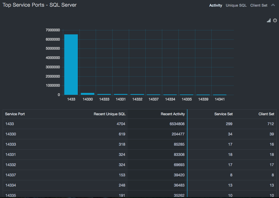 The number of unique MS-SQL and Oracle ports in use can provide insight into the risk of rogue databases in your environment. In many organizations this number should be small (two to four). If it is greater than this, it should be reviewed. If there is no policy of using specific ports for specific purposes, or ports are not being used as part of a named pipes structure then large port numbers could indicate attempts to hide databases from port scans that might locate them.