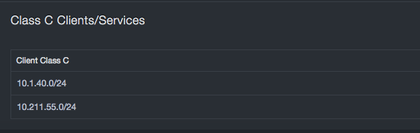 | svc_ip >= INET '10.10.0.0' AND svc_ip < INET '10.10.0.255' | Services in the IP range 10.10.0.0 - 10.10.0.254. |