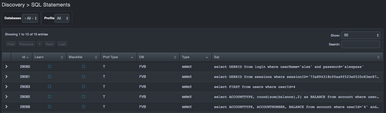 | Blacklisted statements | Statements that are not added to the learned set. Typically, these statements are used to filter out benign statements generated by DBAs or other non-application related interactions |